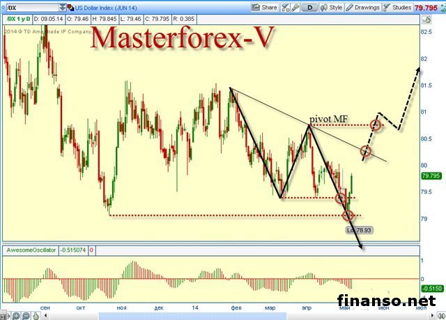 Представители компании брокеров Nord FX отмечают, что стоимость доллара США смогла пробить значимые показатели поддержки 79,375 и 79,06 и достигла уровня 78,93, возвратившись к отметке января прошлого года. Но в настоящее время американский доллар не смог удержаться на этих позициях и пытается укрепиться, ведя торги на отметке 79,795. Дальнейшее падение доллара США будет связано с пробоем нового исторического минимального показателя. Ну а для того, чтобы говорить о развороте тренда с нисходящего на восходящий, необходим пробой сопротивления на наклонном канале МФ и пивоте МФ 80,75.
