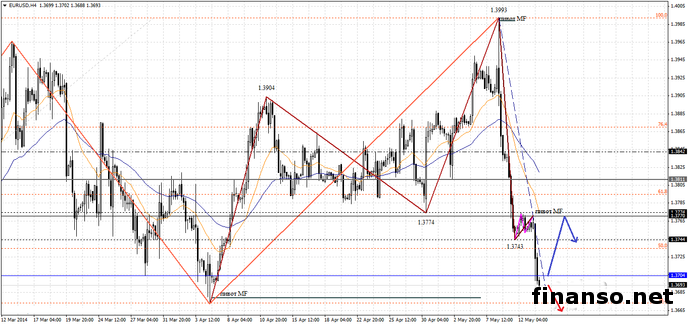 Вчера, 13 мая, стоимость евро снизилась по отношению к американскому доллару. Уменьшение случилось после флетообразных колебаний в понедельник в области 1.3743-1.3774. К обеду вчерашнего дня валюта уже была у отметки 1.3740 доллара, а на торговых сессиях в Америке цена евро находилась в области 1.3690.