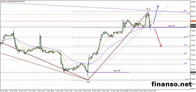Коррекционный спуск доллара США будет ограничен поддержками на отметках 79.80 – 38.2% и 50% коррекционных делений по Фибосеткам; 79.65 – 50% и 61.8% коррекционных уровней по сеткам Фибоначчи; 79.58; 79.05 – пивоты MF.