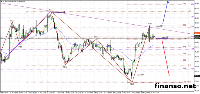 На расположенном ниже графике хорошо видно развитие построений коррекции к «бычьему» импульсу 78.89-80.35. Коррекционные колебания стоимости доллара Соединенных Штатов Америки будут ограничиваться следующими показателями поддержки: 80.02 – это пивот MF; 79.80 – район скопления 38.2% - 50% коррекционных уровней по сетке Фибоначчи; 79.65 – линии 50% -61.8% коррекции по Фибосеткам; 79.58; 79.05 – пивоты MF и 78.89 – это локальный минимальный показатель, преодоление которого станет продолжением долгосрочного снижения стоимости американского доллара.