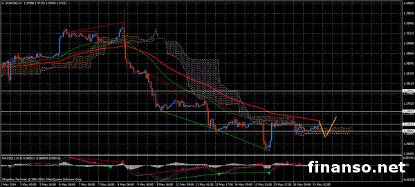 Как и ожидалось, пара EUR/USD по-прежнему движется вниз. Диапазон торгов составил приблизительно 126 пунктов. Уровень цены Low спустился к минимальной отметке 1.3648, в то время как показатель цены High сформировался около вершины 1.3775. На протяжении сегодняшнего дня, 19 мая, представители брокерской компании ForexTrend прогнозируют продолжение коррекции в границах облака Ишимоку, о чем они и сообщили корреспондентам онлайн-издания "