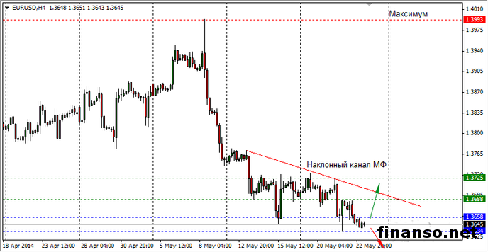 В случае, если верхняя линия границы коридора консолидации будет пробита по восходящей, будет отмечен рост стоимости евро в область 1,3688.