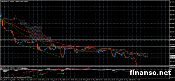 Цена пары евро/доллар осталась на своем показателе и всю пятницу провела в зоне коррекции. Торговая область составила приблизительно 47 пунктов. Уровень цены Low снизился к минимальной отметке 1.3639, уровень цены High поднялся выше и достиг показателя 1.3687. В пятницу, 23 мая, на протяжении торгового дня эксперты компании брокеров ForexTrend ждали дальнейшего снижения с отработкой прогноза четверга, о чем они и рассказали журналистам интернет-издания «Украина сегодня: Finanso.net».На торговых сессиях в четверг пара валют евро/доллар показала отрицательную динамику. Падение началось после выхода отчетов по индексам PMI в европейских странах, где «отличились» секторы производства Франции и Германии. Невзирая на слабую статистику по числу заявок на пособие по безработице и продажам вторички на жилищном рынке Америки, евро не сумел восстановиться и продолжил снижаться. В пятницу пара евро/доллар вела торги ниже отметки завершения предыдущих торгов. Из экономических данных, которые могут повлиять на динамику цен пары евро/доллар, состоялся выход данных по индексу делового климата Германии IFO и отчетов по продажам новостроек в Соединенных Штатах. |