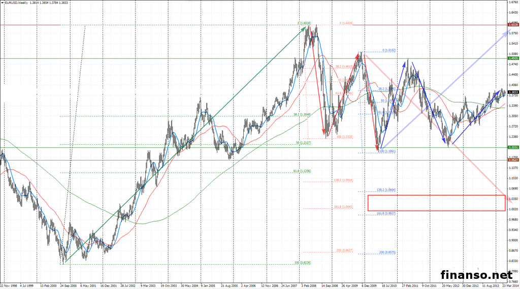 Анализ валютной пары евро/доллар.Данный недельный график охватывает период начиная с 2000 года. На данном графике предкризисный период обозначен зеленой стрелкой, и он характеризовался ростом курса евро по отношению к доллару практически вдвое в течение восьми лет. Но как можно увидеть, в 2008 году тренд изменился, и только за один год цена прошла вниз 50% от восходящего движения, при этом после этого цена пошла вверх и было еще две подобных волны. Сейчас, с точки зрения технического анализа, вероятны два варианта дальнейшего развития событий: движение вверх с целью около исторического максимума 1.6028 и вариант движения вниз к целям паритета. Отметив факт падения курса евро в третьей волне кризиса в 2010 году, необходимо проанализировать дневной график, который соответствует третьей синей стрелке вверх на предыдущем графике, то есть с середины 2012 года и до текущего момента. Так, на графике зеленой стрелкой указано завершение грядущего нисходящего тренда. В июле 2012 началось восходящее движение, которое длится до сих пор. В настоящее время, с технической точки зрения, ближайшей целью движения вверх служит уровень 1.4246, а о невыполнении целей в третьей синей коррекционной волне (1.2400-1.2250) можно будет вспомнить в том случае, если произойдет разворот вниз с пробоем уровня поддержки 1.3770 и закреплением цены ниже объемного уровня 1.3793. На четырехчасовом графике видно, что с начала февраля наблюдается сложное сочетание внутренних волн, а также видна четкая реакция на уровень 1.3675, который сыграл роль непреодолимой поддержки. Начиная с 13 марта, после обновления максимума, цена показала отскок от 1.3675 и в дальнейшем движении необходимо следить за ситуацией на уровнях 1.3793, 1.3820. Для принятия конкретных торговых решений выводы долгосрочного анализа необходимо скоррелировать на движения младших волновых уровней, проведя объемно-волновой анализ движения вниз начиная с 8 мая и участок торговли с 29 мая (от локального минимума) по текущий момент. |