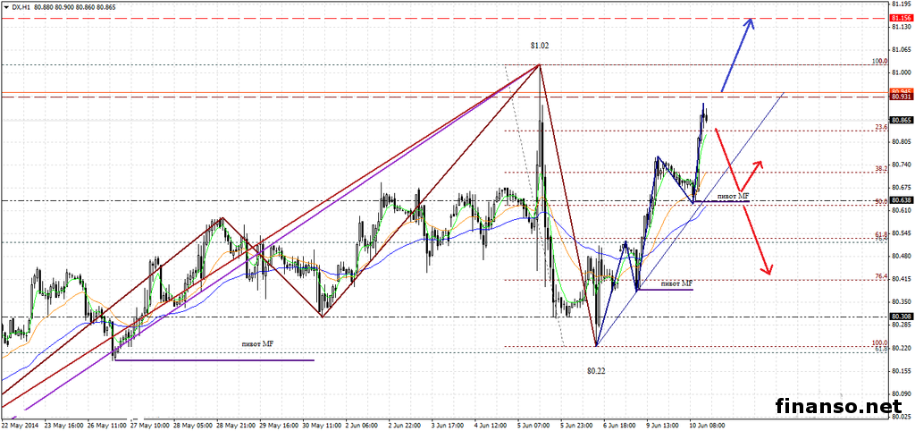 Доллар в ожидании поддержки от рынка труда США.Сегодняшняя торговая сессия носит важное экономическое событие для курса доллара, а именно публикацию очередных данных по рынку труда США. Так, сегодня для участников фондовых рынков должны были быть представлены данные по уровню свободных вакансий и текучести рабочей силы. Данная новость может оказать самое значительное влияние на курс доллара США за сегодняшний день. Необходимо отметить, что в настоящее время на графике сформировалась восходящая тенденция с декабря 2012 года. Индекс доллара перед торгами на американской сессии.На представленном ниже часовом графике доллара США можно увидеть среднесрочный восходящий тренд, но в конце прошлой недели появилось движение против существующей тенденции 81,02-80,22. Дальше с локального минимума на уровне 80,22 началось новое восходящее движение и прошло уже пять волн, которые смогли преодолеть 76.4% коррекции по уровням Фибоначчи от прошлого движения. Сейчас движение остановилось на допустимом уровне коррекции 80,93. Пробитие данной отметки отменит вариант "бычьего" коррекционного движения, а для рассмотрения "бычьей" волновой структуры сформировался восходящий наклонный канал MF. Уровни сопротивления находятся на 80,93, 81,02, а уровни поддержки располагаются на 80,63 и 80,38, и канал MF, как дополнительный уровень поддержки. |