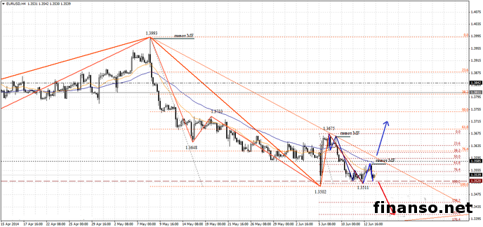 Однако в четверг, 12 июня, падение евровалюты ненадолго приостановилось. Произошло это в то время, когда пара рванула вверх до уровня 1.3578. Потом на последней торговой сессии недели в пятницу, 13 июня, пара евро/доллар опять начала спускаться от установленного максимального значения за 2 дня 1.3578.