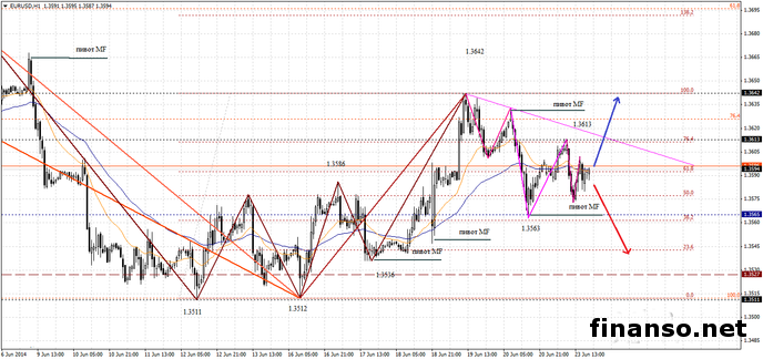 Максимальное значение торгового дня было установлено во время сессии в Азии на уровне 1.3613, с которого стоимость евровалюты начала слабеть к американскому доллару. На торговой сессии в Европе пара валют установила минимум торгов на уровне 1.3573. К завершению торговой сессии 23 июня «медвежье» давление на евровалюту чуть ослабело, и пара торговалась в центре коридора.