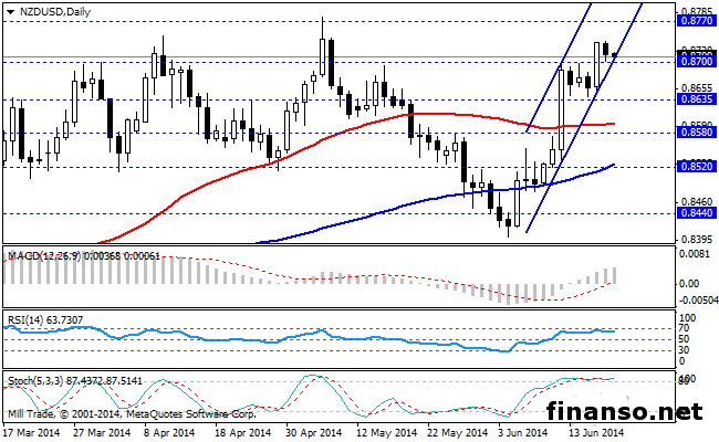 Новозеландская национальная валюта замедлила подъем и консолидировалась над круглой отметкой 0.8700. Стоимость создала незначительную «медвежью» свечу с продолговатой тенью вниз. Синяя линия на предоставленном ниже графике обозначает 100-периодную простую скользящую среднюю, которая построена на основе стоимости завершения (close). Красная линия обозначает 50-периодную скользящую среднюю, которая создана на основе стоимости завершения торгов (close). Размеры показателя MACD следующие: достаточно быстрая экспоненциальная скользящая средняя равна 12 на основе стоимости завершения торгов, медленная экспоненциальная скользящая средняя равна 26 на основе курса закрытия, сигнальная простая скользящая средняя расположена на 9 на основе стоимости завершения.Нахождение столбиков индикатора MACD над значением «нуль» говорит о положительной динамике индикатора, а столбики индикатора MACD, расположенные под нулевой линией, констатируют отрицательную динамику индикатора. Параметр созданного на основе курсов завершения торгов индикатора RSI равна 14. Территория перекупленности индикатора RSI определена пересечением линии индикатора над отметкой 70, а область перепроданности индикатора RSI определена пересечением линии индикатора под отметкой 30. Для того, чтобы было удобно определять направление тренда, в окне индикатора RSI находится уровень 50. Параметры индикатора стохастик (Stochastic Oscillator) такие: период %K равен 5, период %D – 3, период замедления – 3. Индикатор стохастик создан по методу простой скользящей средней на основании средней стоимости (Low/High). Область перекупленности индикатора стохастик определена пересечением линии индикатора над отметкой 80, а область перепроданности индикатора стохастик определена пересечением линии индикатора под показателем 20. За ситуацией валютной пары на рынке Форекс следили корреспонденты издания «Украина сегодня: Finanso.net». |
