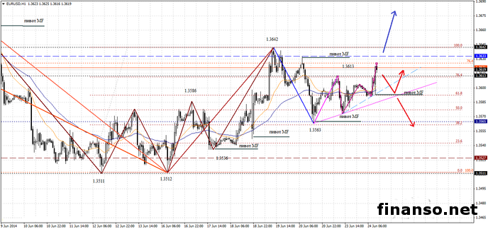 На протяжении вчерашнего дня и первой половины сегодняшнего, 24 июня, пара валют евро/доллар вела торги в диапазоне горизонтальной области 1.3573-1.3613, созданной по минимумам и максимумам понедельника, 23 июня.