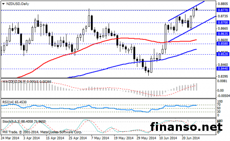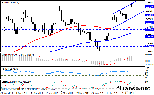 Совершив пробой отметки 0.8770, пара новозеландский доллар/американский доллар добралась до верхней границы коридора. Потом стоимость совершила отскок вниз и консолидировалась, создав небольшую «медвежью» свечу с продолговатой тенью вверх. Синяя линия на графике обозначает 100-периодную простую скользящую среднюю, которая построена на основе стоимости завершения торгов. Красная линия - 50-периодная скользящая средняя, сформированная на основе курса закрытия. За ситуацией на рынке Форекс следили корреспонденты интернет-издания «