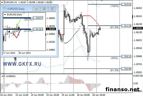 Картина последнего торгового дня для пары евро/доллар. Важными отметками на пятницу, 27 июня, являлись те, которые показаны на часовом графике. Индикатор АО располагается на отрицательной территории и увеличивается, констатируя коррекцию накануне вероятного продолжения спуска. Индикатор тренда говорит об уменьшении стоимости пары евро/ доллар США. Эксперты советуют не входить в рынок.
