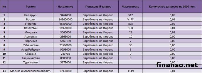 Хотя определить предпочтения определенной нации в чем-либо довольно сложно, однако словосочетание Форекс-рынок является существенным не только для развития людей, но также для заработка собственных средств, поэтому этот вопрос интересует большую часть россиян, вводящих его в поисковый запрос. Такую информацию сообщают корреспонденты издания «Украина сегодня: Finanso.net».О наиболее популярных и необычных запросах, задаваемых россиянами в тематике «заработать на Форексе», сообщает издание «Биржевой лидер»: Указанный рейтинг популярности запросов о лучших брокерах Форекс был составлен: - на основе, рассчитанной с помощью сервиса wordstat.yandex.ru частоте слов за месяц на Яндекс. Директ; - регионом анализа была избрана РФ. Запрос «заработать на Форекс» среди жителей РФ с помощью Яндекс.Какую информацию ищут россияне о брокерах Форекс: ![]() Жителями РФ в соответствии с этими данными запрос «заработать на Форексе» был введен в июне текущего года 5580 раз, при этом первое место в заданной тематике занял вопрос «как заработать +на Форексе (2969 запросов). Также велся поиск: - как заработать +на Форекс – 2602 запроса; - можно заработать +на Форекс – 862; - зарабатывают ли +на Форекс – 915. ![]() На втором месте оказался запрос «+как заработать на Форекс» (2892 запроса за месяц в Яндексе), а с ним вместе интересовались: - +как заработать +на Форекс – 2602 запроса; - +как заработать в Форексе – 204; - Форекс +как заработать видео – 185 и др. ![]() В третьей строчке рейтинга оказалось «+как заработать +на Форекс» с 2602 запросами за июнь в Яндексе, а вместе с этим россияне искали: -+как заработать +на Форекс видео – 168 запросов; - +как заработать денег +на Форексе -104; - +как заработать деньги на +Форексе -104 и др. При этом востребованность запроса «заработать на Форексе» в Яндексе в июне 2014 г. проявилась следующим образом среди жителей стран: -Беларусь – 0,05 запроса из расчета на тысячу населения; NordFX - РФ – 0,04; - Украина – 0,02; - Казахстан – 0,01; - Молдова – 0,01. Используют возможности рекламы и развивают свой пиар по запросу «заработать на Форекс», пользуясь услугами Яндекс. Директа следующие брокеры: 1 – Альпари; 2 – Фибо Групп; 3 – Mill Trade; 4 – Форекс Тренд; 5 – NordFX; 6 – HYCapitalMarkets; 7 – GKFX; 8 – Телетрейд; 9 – Пантеон-Финанс; 10 – Activ Trades; 11 – FBS; 12 – Тусар Форекс; 13 – ХМ; 14 – RVDMarketsLtd; 15 – Трейд Форт; 16 – Фреш Форекс; 17 – UFXMarkets; 18 – PROFITGroup. |