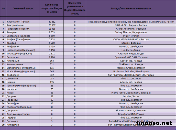 При существующих в мире способах борьбы с депрессией, среди которых много народных методов, признанных действующими научным миром, например: валериана, соли брома (снижает возбудимость), женьшень с кофе (поддерживает эмоциональность), все же самым известным и популярным способом вывода из депрессии остаются таблетки, как пишут корреспонденты издания «Украина сегодня: Finanso.net».О востребованности среди россиян существующих антидепрессантов сообщается в материалах издания «Биржевой лидер». Важным аспектом действия антидепрессанта является создание в мозге человека взвешенного баланса химэлементов, поэтому существует большое разнообразие разных антидепрессантов, воздействующих на химэлементы человеческого мозга. Чаще всего прописанные врачом антидепрессанты помогают, при этом легче становится через одну – три недели после начала приема препарата, сопровождаемого (хотя и редко) некоторым расстройством пищеварения, чувством тревожности, нарушением сна, отсутствием аппетита или головной болью. Родителям рекомендуется внимательно следить за поведением своего ребенка при приеме такого средства, сообщая врачу о возможных признаках маниакального поведения и биполярного расстройства, поскольку такое поведение могут спровоцировать принимаемые антидепрессанты. Прием этих препаратов ограничивается или не рекомендуется при планировании или в случае беременности. Лидером в Сети среди россиян оказался антидепрессант «Флуоксетин».Используя такие базовые критерии, как оценка за месяц частоты слов для Яндекс.Директа и рассчитанного с помощью агрегатора Яндекс.Новости числа упоминаний о химпрепарате в СМИ, за последний месяц был определен рейтинг популярности антидепрессантов среди россиян. В результате самым популярным препаратом (антидепрессантом) среди жителей РФ стал «Флуоксетин» («Прозак»), которым интересовались 39252 раза. Стимулирующие действия у него сочетаются с антидепрессивными, он снижает напряженность, улучшает настроение, устраняет дисфорию, не кардиотоксичен. На рынке уже 20 лет. ![]() С 25667 запросами в Яндексе второе место занял медпрепарат «Аминотриптилин», отличающийся противотревожным эффектом, снотворным и седативным действием. Препарат «Пароксетин» («Паксил») с 13338 запросами россиян за последний месяц занял третье место. Отличается сильным противотревожным действием. Выпускается во Франции. Популярными среди россиян являются также такие антидепрессанты: - Феварин (8953 запроса), Нидерланды; - Сертралин (Золофт) (8690), Италия; - Пипофезин (5328), Россия; - Коаксил (5280), Франция; - Анафранил (3459), Швейцария; - Циталопрам (3458), Дания; - Миансерин (2671), Нидерланды; - Пиразидол (2486), Украина. Тридцатка же самых востребованных препататов отражена в таблице. Упав в цене на шесть процентов на торгах 23 июля, акции фармацевтической компании GlaxoSmithKline несколько дней спустя (27 июля) торговались на уровне 48,6 американских доллара в нисходящем тренде после оглашения финрезультатов работы компании. По мнению аналитотдела брокера UFX Markets, инвесторам рекомендуется от покупок воздержаться. |