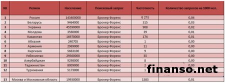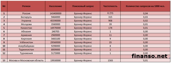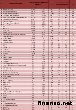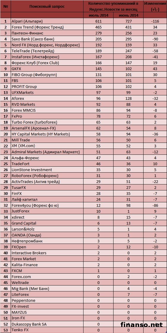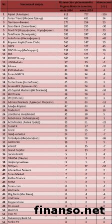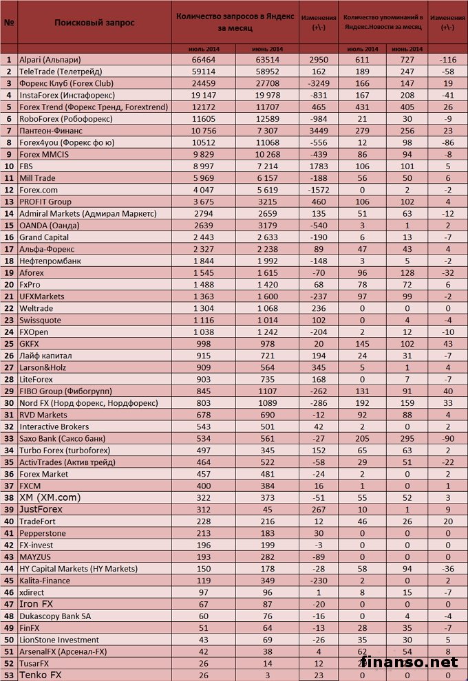 «Выбирая для себя в качестве финпартнера брокерскую компанию, начинающий трейдер среди параметров ее надежности должен считать важными низкие спреды, показатели минимального депозита, а также ее популярность на Форекс-рынке», - пишут корреспонденты издания «Украина сегодня: Finanso.net».Наивысшая популярность в Интернете за июль 2014 г. - у Альпари и TeleTRADE.На основе трех базовых критериев Академией Masterforex-V был составлен рейтинг популярности Форекс–брокеров, как сообщает издание «Биржевой лидер», в число критериев входили частота слов за месяц для Яндекс.Директа и рассчитанное с помощью агрегатора Яндекс.Новости число упоминаний брокера в сетевых СМИ, а регионом исследования были страны СНГ, в том числе РФ. На первом месте расположилась брокерская компания «Альпари», являющаяся одной из крупнейших в РФ. Компанией интересовались в поисковой системе Яндекс 66464 раза, брокер активно занимается трейдингом, инвестированием и внедрением инвестпрограмм. Брокер «TeleTrade» занял второе место, на рынке больше двадцати лет, обладает 150 офисами в двадцати мировых странах, известен своими аналитическими программами (59114 запросов). Основанная семнадцать лет назад компания «Forex club» заняла третье место, она занимается спецпрограммами для обучения и предоставляет услуги интернет-трейдинга (24459 запросов). Далее последовали такие брокерские компании: - InstaForex (19147 запросов); - «Форекс Тренд» (12172); - RoboForex (11605); - Пантеон–Финанс (10756); - Forex4you (10512); - FBS (6997); - Mill Trade (5969; - Forex.com (4047); - PROFIT Group (3675); - Адмирал Маркетс (2794); - Оанда (2639); - Grand Capital (2443); - Альфа-Форекс (2327); - Нефтепромбанк (1844); - Aforex (1545); - FxPro (1488); - UFXMarkets (1363); - Weltrade – 1304; - Миг Банк (1116); - FXOpen (1038). При этом соответствующий запрос «брокер Форекс» в июне в поисковике Яндекс чаще всего вводили жители следующих стран: - РФ (0.04 запроса на тысячу жителей страны); - Беларусь – 0.03; - Украина – 0,02; - Молдова – 0,01; - Казахстан – 0,01. Самыми популярными брокерам по числу их упоминаний в системе Яндекс.Новости в июле 2014 г. стали: В тройке лучших: - «Альпари» (611 упоминаний); - «Форекс Тренд» - (235 упоминаний); - Пантеон-Финанс – (279 упоминаний в СМИ за месяц). Таким образом, исходя из выводов Академии Masterforex-V, оказалось, что лидерами рейтингов среди брокеров Форекс по числу запросов в Яндексе в июле стали компании Альпари», «Телетрейд» и Форекс Клуб, а по числу упоминаний в сетевых СМИ лучшими стали: «Альпари», «Форекс Тренд» и Saxo Bank. |