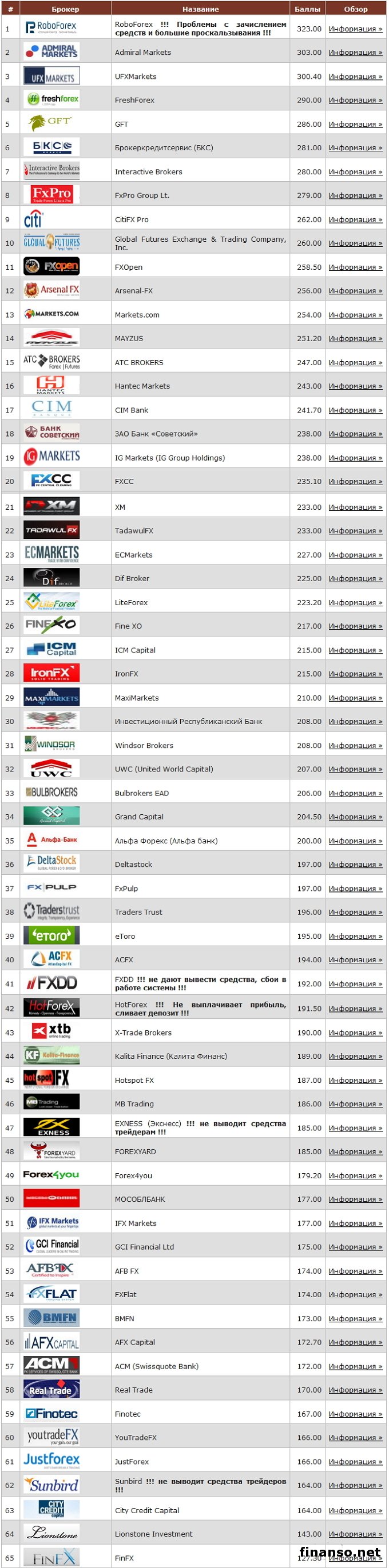 Поможет сохранить вам ваше время и нервы при выборе достойной для работы на Форекс-рынке компании внимательное изучение рейтинга брокеров. Лучшие из них заслужили позитивную оценку своих клиентов, делают свою работу на совесть и относятся к высшей лиге брокеров. Однако есть, по мнению экспертов, и брокеры второй лиги, не дотягивающие по ряду причин до высшей ступени рейтинга, но стремящиеся достичь высоких вершин. Об этом сообщают корреспонденты издания «Украина сегодня: Finanso.net».Вторая лига брокеров Форекс глазами экспертов Masterforex-V.С учетом голосования инвесторов и трейдеров, на основе двадцати независимых один от другого критериев, Академия Masterforex-V создала рейтинг лучших Форекс-брокеров. К названным критериям относятся: - наличие уважаемой биржевой лицензии; - общий срок работы брокера на рынке; - число международных наград; - небольшой уровень спреда по 5 основным валютным парам; - положительная оценка на форуме трейдеров; - число филиалов и офисов компании в РФ и других странах. В высшую лигу рейтинга брокеров Академии Masterforex-V попадают компании, набравшие более 350 баллов. Вторая лига Форекс-брокеров и возможных кандидатов в высшую лигу представлена следующим образом: На первом месте во второй лиге с 323 баллами находится компания «RoboForex», оказывающая услуги частным и корпоративным клиентам на международном финрынке, работающая здесь с 2010 г., у компании имеются проблемы с проскальзываниями и с зачислением средств. На втором месте второй лиги находится компания «Admiral Markets», заработавшая 303 балла, лицензию ЕС она получила в 2009 г., работает в 17 странах мира, уставной капитал 1,5 миллиона долларов. Клиенты компании жалуются на медленное исполнение ордеров брокером. Замыкает тройку лидеров второй лиги с 300,4 балла среди явных претендентов, компания «UFXMarkets», имеющей высокий выбор активов (в виде 45 валютных пар, сырьевых товаров, индексов, контрактов на разницу). У компании имеются проблемы с последовательностью проводимых сделок. На последующих местах разместились предоставляющие услуги на Форекс-рынке следующие брокеры второй лиги: - FreshForex; - GFT; - Брокеркредитсервис; - Interactive Brokers; - FxPro Group Lt.; - CitiFX Pro; - Global Futures Exchange & Trading Company, Inc.; - FXOpen; - Arsenal-FX; - Markets.com; - - MAYZUS; - ATC BROKERS; - Hantec Markets; - CIM Bank; - ЗАО Банк «Советский»; - IG Markets (IG Group Holdings); - FXCC; - XM; - TadawulFX; - ECMarkets; - Dif Broker; - LiteForex; - Fine XO; - ICM Capital; - IronFX; - MaxiMarkets; - Инвестиционный Республиканский Банк; - Windsor Brokers; - UWC (United World Capital); - Bulbrokers EAD; - Grand Capital; - Альфа Форекс (Альфа банк); - Deltastock; - FxPulp; - Тraders Trust; - eToro; - ACFX. По убеждению одного из руководителей факультетов Академии Masterforex-V Е. Остапенко, работа на бирже Форекс требует серьезного отношения к ней и соблюдения ее правил и законов, о чем сообщило издание «Биржевой лидер». |