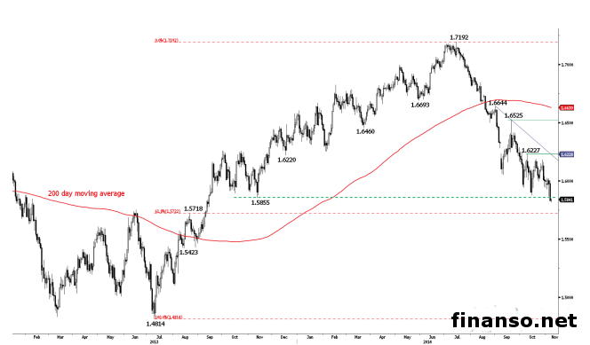 Пробив ключевую поддержку на уровне 1.5855, пара GBP/USD резко снизилась в четверг, 6 ноября. При 61,8 процента коррекции, поддержкой становится сейчас уровень 1.5718 (максимум 21 августа 2013 г.). На уровне 1,5955 (внутридневной минимум) и уровне 1,5887 (внутридневной минимум) можно найти часовые сопротивления, пишут корреспонденты издания «