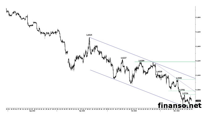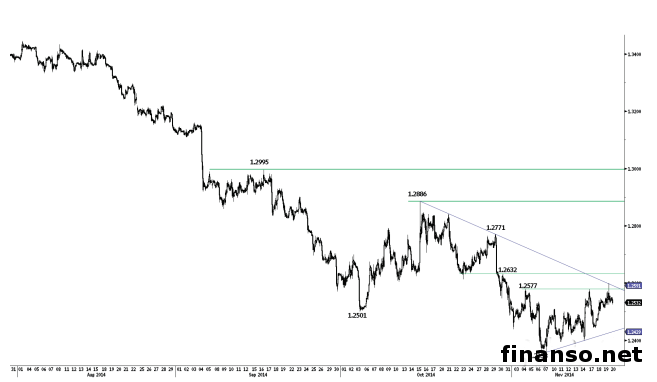 Продолжает свой рост выше пара EUR/USD, не затронув вместе с тем сопротивление в точке 1,2577 (на нисходящей трендовой линии). На отметке 1,2632 находится другое сопротивление, а на уровнях 1,2444 (минимуме 18 ноября 2014 г.) и 1.2502 (внутридневном минимуме) можно найти часовые поддержки. Об этом пишут корреспонденты издания «Украина сегодня: Finanso.net».В нисходящем тренде, с учетом своей длительной перспективы, пара евро-американский доллар находится с мая 2014 г. По мнению специалистов компании Swissquote, снижение по направлению к серьезной поддержке в точке 1,2043 (минимуме 24 июля 2012 г.), открыл прорыв значительной поддержки между 1,2755 (минимуме 9 июля 2013 г.) и 1,2662 (минимуме 13 ноября 2012 г.). Об этом рассказывает издание «Биржевой лидер». На положительных статданных евро несколько продвинулось.Достигнув своего максимума на уровне 1,2569, выше ключевого уровня 1,2500 вернулась пара в среду, 19 ноября 2014 г. На опубликованных статданных из еврозоны, оказавшихся несколько лучшими, чем это ожидалось, такими как данные по счету текущих операций, статданные торговли, а также ВВП, евро очень хорошо продвинулось. В последние месяцы общий тренд евровалюты был «медвежьим», поэтому этих данных оказалось достаточно для приостановки ее спада. Слегка затронули американский доллар поступившие из этой страны статданные по индексу разрешений на строительство и строительство нового жилья. От размера 1,017 миллиона единиц в сентябре, по сравнению с прогнозом на увеличение до 1,025 миллионов единиц, до 1,009 миллионов единиц в годовом выражении, на 2.8 процента, с учетом сезонных колебаний, неожиданно упал в октябре индекс начала жилстроительства. Однако несмотря на этот фактор, к 6,5-летнему максимуму приблизилось число разрешений на строительство. По сравнению с политическим заявлением, почти «голубиную» риторику продемонстрировал обнародованный протокол заседания ФРС во время проходившей очередной сессии в США, в среду. Хотели бы не обращать внимание на существующие инфляционные ожидания некоторые из членов, обеспокоенные возможностью дефляции. По GBP/USD удерживается недавний минимум 1,5593.Достиг максимума в среду на уровне 1,5699 стерлинг, отреагировав на публикацию протокола Банка Англии и отскочив от своего дневного максимума 1,5588. |