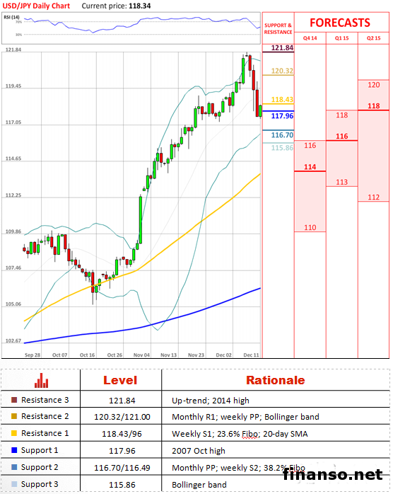 "Эта восходящая коррекция предполагает чуть более сильный импульс для потребления услуг в четвёртой четверти, но по большому счёту это мало повлияет на рост ВВП в четвёртом квартале."- JPMorgan iв Нью-Йорке (по материалам Reuters) Перспективы пары Слабость доллара США стимулирует оздоровление японской йены, так как сейчас пара USD/JPY достигла отметки 118, а это означает, что кросс потерял практически 400 пунктов за одну неделю. На 116.75/56 находится относительно сильная поддержка (месячная РР и недельная S2), которая потенциально может сдержать нынешнее падение и придать необходимый бычий импульс для отскока. Настроение трейдеров Настроение трейдеров рынка SWFX по отношению к USD/JPY продолжает оставаться нейтральным, так как сегодня 51% участников рынка держат длинные позиции. Что касается ордеров в пределах 100 пунктов от спота, то большинство (58%) выставлены на покупку. По материалам Dukascopy. |