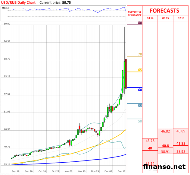 ![]() «Прошедшее вчера заседание по вопросам финансовой ситуации заставляет участников рынка сделать только два вывода: ограничения движений капитала пока не рассматривается в качестве потенциальной меры, при этом Центральный банк будет и далее будет способствовать стабилизации валютного рынка». - Банк «Зенит» Обзор После максимального начиная с 1998 года падения курса рубля по отношению к доллару США во вторник, вчера российская национальная валюта значительно укрепилась по отношению к доллару достигнув отметки 60. Эксперты говорят о том, что коррекция, вероятнее всего, является несколько запоздавшей реакцией рынка на увеличение ключевой ставки Центробанком РФ с 10.5% до 17% в ночь на вторник, а также небольшим ростом уровня нефтяных котировок. Кроме того, Банк России продал 15 декабря 1.961 миллиардов долларов для поддержки российской национальной валюты. Несмотря на это, аналитики видят довольно сильную корреляцию курса рубля и стоимости нефти, которые в скором времени будут оставаться низкими. Так, в среднесрочной перспективе ослабление рубля при высокой волатильности будет считаться основным сценарием развития ситуации. По материалам Dukascopy. |