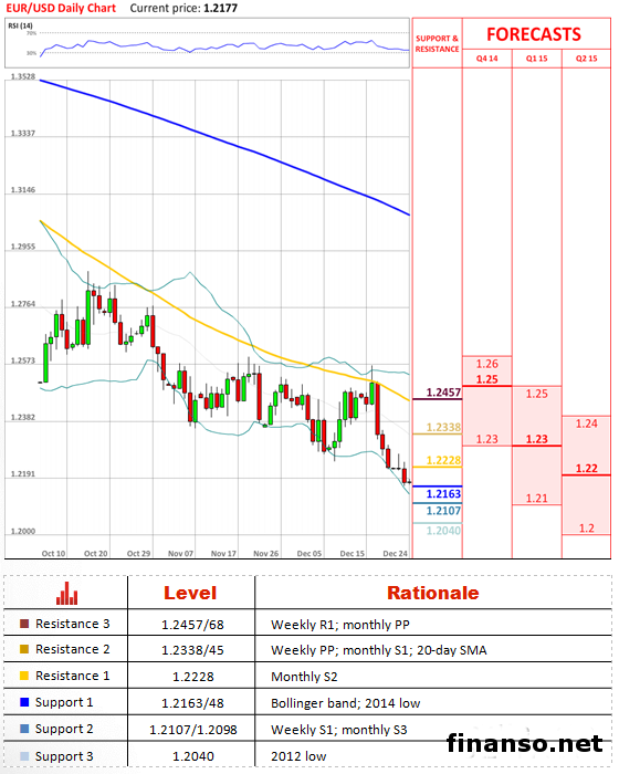 «Я имею надежду, что в первой половине следующего года нам все же удастся увидеть достаточно хороший рост, однако не настолько сильный, как мы видим в настоящий момент», - Tufts University (по материалам Bloomberg).Перспективы валютной пары EUR/USD.Еще вчера, 23 декабря текущего года, на рынке Форекс наблюдалось значительное падение валютной пары евро/доллар, а в конце декабря месяца она и вовсе установила новый годовой минимум, который находится между месячной S3 и S2 на 1.2163. Мы можем наблюдать отскок евро до отметки 1.2230, но в краткосрочном периоде, а позднее пара, вероятнее всего, упадет еще больше. В это же время следующая область спроса находится вблизи отметки 1.21 (месячная S3; недельная S1) попытаются продвинуть валютную пару выше. Что говорят трейдеры Форекс?Свой рост продолжило количество длинных позиций на покупку европейской валюты против американской, а за последние сутки их количество достигло 55 процентов. В это же время количество выставленных на покупку в пределах 100 пунктов от спота ордеров выросло до 45 процентов, что является наибольшим значением за последние пять дней. По материалам: Dukascopy |