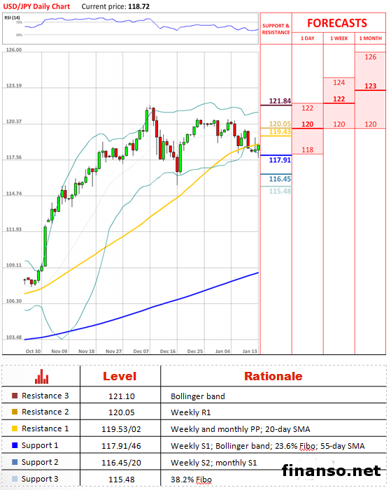 «В настоящее время фактором, который способствует неприятию риска, считается падение цен на нефть. И крайне малой является вероятность того, что аппетит к риску вернется до того, как не будет ясна нижняя граница цены на нефть. При этом давление на укрепление иены увеличивается, так как фаза неприятия риска углубляется», - IG Markets Securities Ltd. (based on Bloomberg).Перспективы валютной пары USD/JPY.Так как отсутствие фундаментальных данных, которые двигают валютную пару, доллар/иена осталась без изменений - немного выше отметки 118. Однако так как доллар вряд ли преодолеет критические поддержки, настроение улучшилось. Примечательно, что ближайшая основная область спроса представлена 55-дневным SMA и уровнем коррекции 23,6 процента, за которым тут же следует уровень коррекции 38,2 процента на 115,20. Но для подтверждения своих долгосрочных бычьих намерений американских доллар должен закрыться выше уровня 122. Что говорят трейдеры?Людей, купивших валюту, больше, чем тех, кто продал ее, что, в свою очередь, поспособствовало росту длинных позиций, которые теперь составляют 57 процентов рынка. И все это в то время, когда американский доллар не активен. В это же время доля ордеров, которые были выставлены на покупку, упала до 51 процента с 60-ти. По материалам: Dukascopy |