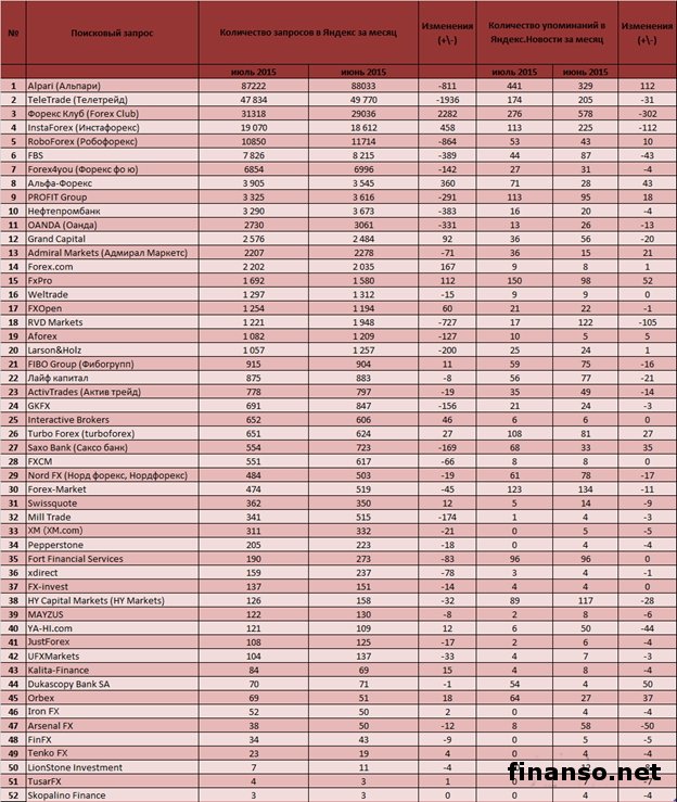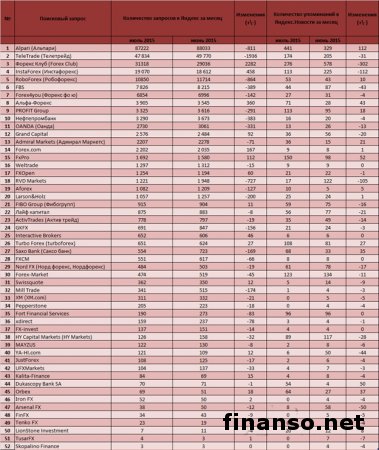 Определиться с выбором брокера можно разными способами. Взять, например, размер кредитного плеча, низкие спреды – можно делать выбор. Но этого мало, так как стоит понять: насколько тот или иной брокер известен в числе жителей определенной страны или региона? Какой именно брокер стал наиболее известным в странах СНГ, какая компания проявила наивысший уровень профессионализма? С ответом на этот вопрос разбирались специалисты издания по экономике «Биржевой лидер» вместе с рейтингом брокеров Академии Masterforex-V. Alpari и TeleTRADE – самые известные брокеры в сети Интернет за июль 2015 года.Рейтинг популярности брокеров составлен по трем базовым критериям: - оценка частотности слов для системы поиска Яндекс.Директ за месяц, что рассчитана при помощи сервиса wordstat.yandex.ru; - частота упоминаний о компаниях в онлайн-изданиях, рассчитанная с помощью агрегатора news.yandex.ru (Яндекс.Новости); - регион анализа (то есть поиска в сервисе wordstat.yandex.ru) – страны СНГ. - первое место – брокерская компания Alpari (Альпари) – самая большая брокер-компания РФ; - второе место – брокер TeleTrade (Телетрейд); - третье место – брокер Forex club (Форекс клуб). Эта компания существует больше 18 лет. Далее следуют брокеры: - InstaForex (Инстафорекс) – 19 070 запросов в Яндекс; - RoboForex (Робофорекс) – 10 850 запросов в Яндекс; - FBS – 7 826 запросов в Яндекс; - Forex4you (Форекс фо ю) – 6 854 запроса в Яндекс; - Альфа-Форекс – 3 905 запросов в Яндекс; - PROFIT Group – 3 325 запросов в Яндекс; - Нефтепромбанк – 3 290 запросов в Яндекс; - OANDA (Оанда) – 2 730 запросов в Яндекс; - Grand Capital – 2 576 запросов в Яндекс; - Admiral Markets (Адмирал Маркетс) – 2 207 запросов в Яндекс; - Forex.com – 2 202 запроса в Яндекс; - FxPro – 1 692 запроса в Яндекс; - Weltrade – 1 297 запросов в Яндекс; - FXOpen – 1 254 запроса в Яндекс; - RVD Markets - 1 221 запросов в Яндекс; - Aforex - 1 082 запросов в Яндекс; - Larson&Holz – 1 057 запросов в Яндекс; - FIBO Group (Фибогрупп) – 915 запросов в Яндекс; - Лайф капитал – 875 запросов в Яндекс; - ActivTrades (Актив трейд) – 778 запросов в Яндекс; - GKFX – 691 запросов в Яндекс; - Interactive Brokers – 652 запроса в Яндекс; - Turbo Forex (turboforex) – 651 запрос в Яндекс; - Saxo Bank (Саксо банк) – 554 запроса в Яндекс; - FXCM – 551 запросов в Яндекс; - Nord FX (Норд форекс, Нордфорекс) – 484 запроса в Яндекс; - Forex-Market – 474 запроса в Яндекс; - Swissquote – 362 запроса в Яндекс; - Mill Trade – 341 запрос в Яндекс; - XM (XM.com) – 311 запрос в Яндекс; - Pepperstone – 205 запросов в Яндекс; - Fort Financial Services – 190 запросов в Яндекс; - xdirect – 159 запросов в Яндекс; - FX-invest – 137 запросов в Яндекс; - HY Capital Markets (HY Markets) – 126 запросов в Яндекс; - MAYZUS – 122 запроса в Яндекс; - YA-HI.com – 121 запрос в Яндекс; - JustForex – 108 запросов в Яндекс; - UFXMarkets – 104 запроса в Яндекс; - Kalita-Finance – 84 запроса в Яндекс; - Dukascopy Bank SA – 70 запросов в Яндекс; - Orbex – 69 запросов в Яндекс; - Iron FX - 52 запроса в Яндекс; - Arsenal FX – 38 запросов в Яндекс; - FinFX – 34 запроса в Яндекс; - Tenko FX – 23 запроса в Яндекс; - LionStone Investment – 7 запросов в Яндекс; - TusarFX – 4 запроса в Яндекс; - Skopalino Finance – 3 запроса в Яндекс. |