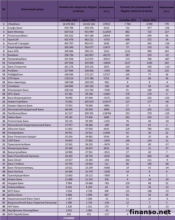 Большая часть финансовых операций в нашем современном мире производится посредством банков. Кроме того, ключевой задачей банков считается сохранение финансовых сбережений граждан государства, в которой эти банковские учреждения производят свою деятельность. Тем не менее, к большому сожалению собственников банковских учреждений, граждане России не слишком доверяют банкам еще с периода существования Советского Союза, когда обманутыми инвесторами стали сотни тысяч человек.Подробностями интересовались корреспонденты издания «Украина сегодня: Finanso.net».По сообщениям портала по экономике «Биржевой лидер», современным банковским организациям приходится достаточно сложно. Им необходимо усовершенствоваться, выпуская на рынок обновленные продукты, рекламироваться, формировать свой собственный имидж. Какие именно наиболее известные банковские учреждения в числе российских граждан, разбирались специалисты информационного издания «Биржевой лидер». Рейтинг «Биржевого лидера» опирается на два вполне объективных критерия в системе поиска Яндекс: - оценка частотности слов для системы Яндекс.Директа за один месяц, которая рассчитана при помощи сервиса wordstat.yandex.ru; - общее число упоминаний за то же самое время о банковском учреждении в онлайн-средствах массовой информации, информационных электронных агентствах, что рассчитано с помощью агрегатора Яндекс.Новости (news.yandex.ru); - регион оценки – Россия. Первое почетное место в рейтинге наиболее известных российских банков до сих пор занимает «Сбербанк», который на протяжении долгих лет продуктивной деятельности смог доказать профессионализм, надежность, оперативность, качество. Он отличается большой сетью филиалов. А это дает отличную возможность клиентам обслуживаться в любом уголке государства. Второе не менее почетное место отдано банку «Альфа-Банку», который существует на рынке России с 1990 года, что в настоящее время из себя представляет универсальное финансово-кредитное учреждение, производящее самые важные банковские операции. Третье место отдано по праву «Банку Москвы», входящему в общее число наиболее масштабных учреждений российского денежного рынка, контролирует свыше трехсот представительств. Банк Москвы предлагает большой список услуг для физических и для юридических лиц. |