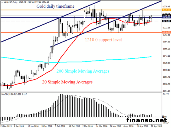 Быки опять вернулись на рынок золота, толкнув тем самым цены дальше уровня сопротивления в 1250 долларов за каждую унцию, потому что долларовая слабость вместе с явным нежеланием вкладчиков как-то рисковать дали им отличную возможность начать новый раунд покупок. Об этом журналистам сайта «Биржевой лидер» поведали специалисты брокер-компании FXTM. Принимая во внимание беспокойство вкладчиков из-за весьма осторожной позиции Федеральной резервной системы, общее рыночное напряжение, привлекательность золота станет выше, при этом вполне вероятен ценовой рост до уровня в 1270 долларов за унцию. С техточки зрения, золото продается выше средней скользящей за три недели, а индикатор MACD стал выше нейтрального уровня. Прошлое сопротивление у 1250 долларов может послужить подвижной поддержкой, в то же время цены, скорее всего, будут расти к уровню 1270 долларов за унцию. Сохраняющаяся слабость американского доллара, скорее всего, будет оставаться основным фактором поддержки для драгметалла. Подробностями интересовались корреспонденты информационно-аналитического издания «