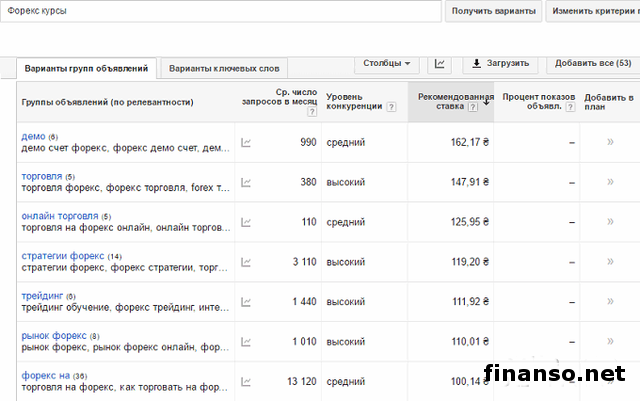 Контекстная реклама – особая разновидность рекламной деятельности, которая предоставляет возможность видеть именно то рекламное объявление, которое вас интересно в сети Интернет. Подробностями интересовались корреспонденты информационно-аналитического издания «Украина сегодня: Finanso.net».Как стало известно журналистам информационно-аналитического издания по экономике и предпринимательству «Биржевой лидер», контекстная реклама работает по особому избирательному принципу. То есть ее видеть может лишь человек, который в той или иной системе поиска ввел запрос, что ей соответствует. Довольно интересно производится оплата рекламодателя за такую рекламу. Вопрос в том, что компания или бизнесмен, который хочет рекламировать личную продукцию или же услуги таким необычным способом, платит не за число ее показов, а конкретно за общее число кликов, которые были произведены пользователями системы поиска по соответствующей ссылке. В то же время стоимость каждого клика может колебаться от пары центов до сотен долларов. Какие ключевые слова в нише «Форекс-курсы» считаются наиболее дорогими в системе Google Adwords, решили выяснить специалисты издания по экономике «Биржевой лидер». Цена ключевых слов в Google Adwords темы «Форекс-курсы».По теме Форекс-курсы в Google Adwords наиболее известными среди российских граждан и самыми дорогостоящими стали такие запросы: - Демо (6 ключевых слов); - Онлайн торговля (5); - Торговля (5); - Стратегии Форекс (14); - Рынок Форекс (8); - Трейдинг (6); - Форекс на (36); - Литература (5); - Форекс для начинающих (10); - Обучение Форекс (31) и так далее. В то же время стоимость этих запросов находится в границах 5,53-162,17 доллара Америки всего лишь за один клик на начало июня текущего года. Аналитики выделили в числе наиболее известных блоков объявлений такие ключевые слова: 1. Демо (5 ключевых слов в системе Google Adwords): - Демо счет Форекс – 284,44 доллара США за один клик; - Форекс демо счет – 231,77 доллара США за один клик; - Форекс демо версия – 166,75 доллара США за один клик; - Форекс демо – 128,18 доллара США за один клик; - Forex демо счет – 93,45 доллара США за один клик; - Демо счет – 75,00 доллара США за один клик. 2.Торговля (5 ключевых слов в системе Google Adwords): - Торговля Forex – 188,69 доллара США за один клик; - Forex торговля – 185,32 доллара США за один клик; - Форекс торговля – 171,34 доллара США за один клик; - Торговля Форекс – 133,54 доллара США за один клик; - Торговля валютой в Интернете. 3. Онлайн торговля (5 ключевых слов в Google Adwords): - Торговля валютой онлайн – 177,22 доллара США за один клик; - Форекс онлайн торговля – 121,43 доллара США за один клик; - Торговля на Форекс онлайн – 85,98 доллара США за один клик; - Онлайн торговля Форекс; - Онлайн торговля на Форекс. |