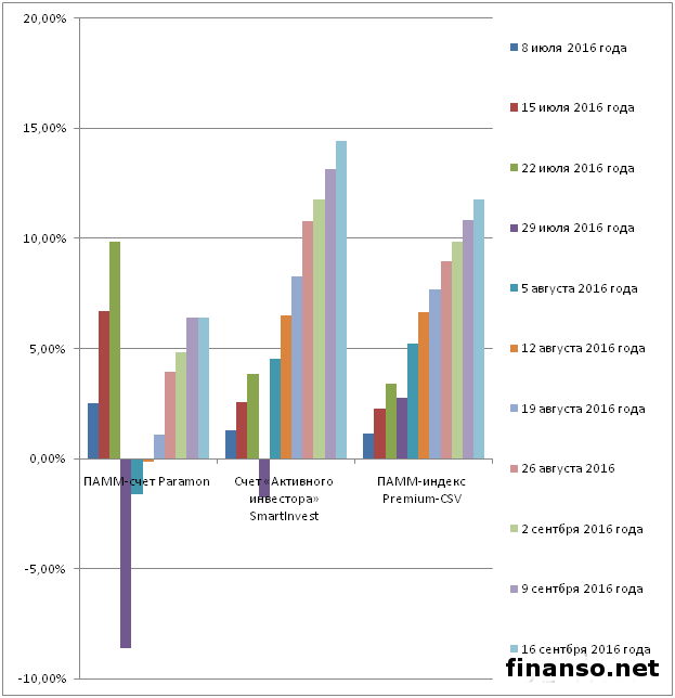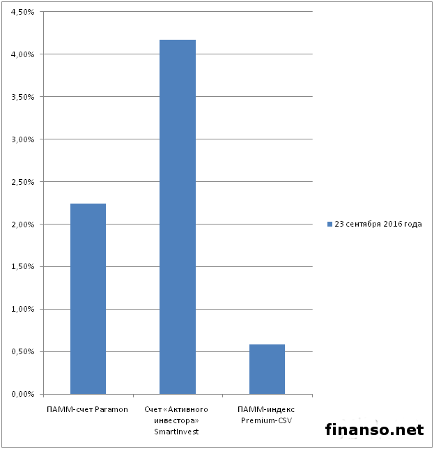 Совсем недавно трейдеры, управляющие счетами инвестиционного портфеля «PrivateFX № 1», получили второе дыхание, сообщают корреспонденты издания для инвесторов «Украина сегодня: Finanso.net». Когда на минувшей неделе инвесторами уже в который раз были зафиксированы доходы и выведены свыше 650 американских долларов, общий доход на протяжении последних пяти торговых дней был равен 237,71 доллара, что равно 1,58 процента за одну неделю. В том числе, прибыль от счета торгового инвестора SmartInvest превысила 4 процента.PrivateFX № 1» сумел заработать уже 12,46 процента.Стоит напомнить, что на позапрошлой неделе инвесторами Masterforex-V в первый раз была зафиксирована прибыль, а также осуществлен вывод из инвестпортфеля «PrivateFX № 1» свыше 860 долларов. И вот, пару дней назад, со счетов дополнительно сняли 650 долларов. При этом, согласно информации на 23 сентября текущего года, на депозитах продолжало оставаться 15349,76 доллара. Из них 15 тысяч были первоначальными инвестициями. В целом же прибыль (учитывая предоставленные средства) с 4 июля по 23 сентября 2016 года достигла 1869,34 доллара, либо 12,46 процента. Ниже в таблице представлены результаты за период с 04.07.2016 г. по 23.09.2016 г.: По словам совладельцев капитала, денег могло бы быть гораздо больше, если бы не влияние двух тормозящих факторов: 1. Уже на четвертой неделе с момента запуска инвестиционного портфеля «PrivateFX № 1» управляющими трейдерами, увы, было допущено немало серьезных просадок, которые после этого нужно было отрабатывать в течение весьма продолжительного времени. 2. Процесс вывода средств с ПАММ-счетов заставляет хоть ненадолго, но все же останавливать все операции на счете. Нужно также отметить, что вывод средств со счетов напоминает палку о двух концах. Так, с одной стороны, определяется прибыль, у нас появляется полная уверенность, что снятые средства не исчезнут после какой-либо просадки. При этом те полторы тысячи долларов, которые были выведены инвесторами в реал, могли бы работать и гарантировать доход в дополнение к тому, который обеспечивается стартовым капиталом в 15 тысяч долларов. На диаграммах можно увидеть статистику понедельной доходности инструментов портфеля «PrivateFX № 1» до и после того, как была зафиксирована прибыль. Доходность инструментов «PrivateFX № 1» по итогам каждой недели до вывода средств (8 июля - 16 сентября 2016 г.): Прибыль инструментов «PrivateFX № 1» после вывода средств (начиная с 16 сентября 2016 г. Как бы там ни было, общий положительный результат инвестиционного портфеля «PrivateFX № 1» в который раз доказал, что распределение капитала по различным инструментам позволяет эффективно диверсифицировать риски и зарабатывать деньги независимо от того, как торгует каждый отдельный управляющий трейдер. Если есть потери в одном месте, то их можно компенсировать доходами в другом. |