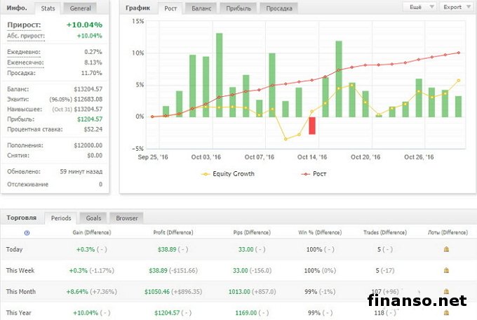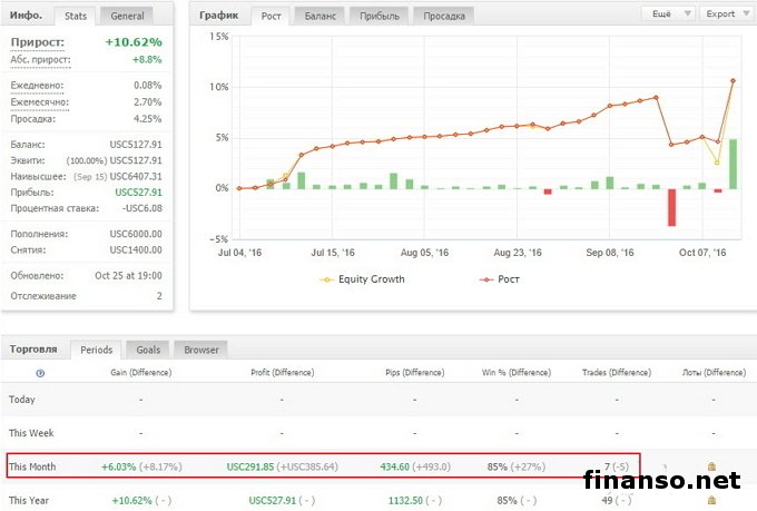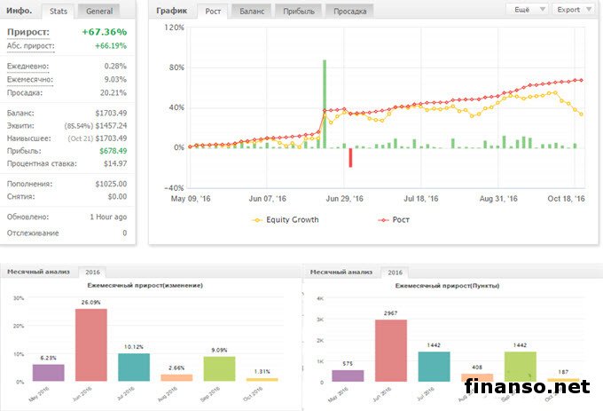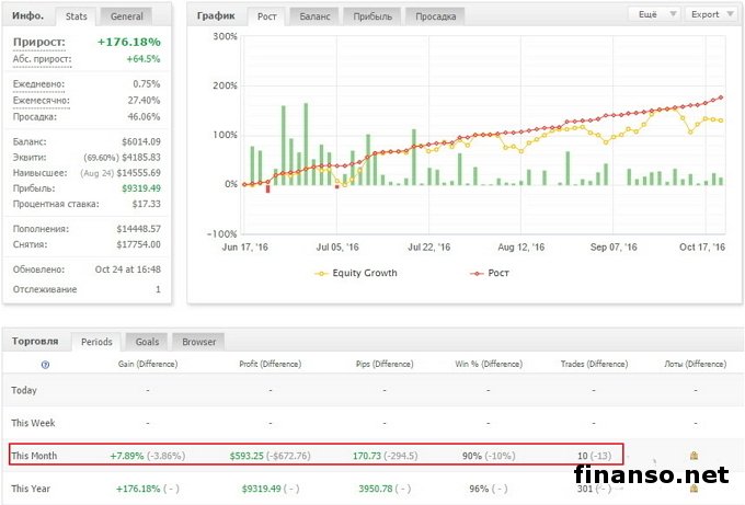 В соответствии с правилами, установленными Клубом инвесторов Masterforex-V, заработанный профит управляющих принято считается исключительно в пунктах, а не сразу в доллара США, так как для различных счетов инвесторов он будет составлять абсолютно разную сумму, смотря от того, о каком лоте идет речь. Об этом сообщают корреспонденты издания «Украина сегодня: Finanso.net» со ссылкой на «Биржевой лидер». В целом за октябрь текущего года пяти лучшим трейдерам Masterforex-V удалось заработать для инвесторов 2700 пунктов.Кому и сколько из этих вип-трейдеров удалось заработать в долларах США с начала текущего года? Лидеры октября 2016 года: На первом месте оказался трейдер с ником evgen50 (представитель факультета изучения торговой системы МФ Академии). Результаты прошлого месяца показали, что он заработал 1013 пунктов прибыли (добавил к депозиту 8,6 процента прироста). Это составило 1050,46 доллара США чистой прибыли при полном соблюдении ММ: Если такая же плодотворная работа сохранится на протяжении ноября, трейдеру достанется инвесторский счет на 50 тысяч долларов США. Прибыль будет распределена так: инвестор получит 70 процентов дохода, а трейдер, соответственно, 30. На вторую строчку сумел подняться трейдер rubikon (факультет изучения торговой системы МФ Академии), который в прошлом месяце заработал 886 пунктов (прирост к депозиту составил 8,2 процента), показав прибыль в 159,38 доллара: Кроме того, к данному счету трейдера rubikon подключаются еще шесть инвесторских счетов с депозитом по 2000 долларов США, прибыль от которых распределяется в пропорции 60% инвестору и 40% прибыли – трейдеру. Таким образом, трейдер дополнительно за октябрь месяц заработал 765,02 доллара США. Третью позицию за собой сохранил за собой трейдер Alex-Zein, который в прошедшем месяце показал прибыль в 170 пунктов, (увеличив депозит на 7,89%, что соответствует прибыли в 593,25 доллара США): У трейдера Alex-Zein есть восемь счетов инвесторов по 1000 долларов США, которые подключены к его личному счету в пропорции 50% прибыли инвестору и 50% прибыли – трейдеру. Поэтому трейдер в октябре дополнительно заработал 136 долларов США. Четвертая позиция досталась трейдеру mmsgi от кафедры СРП/AO_Zotik Академии заработав 434 пункта прибыли (продемонстрировав рост депозита на 6,03 процента): Трейдер mmsgi также располагает подключенными счетами инвесторов: 12 счетов инвесторов по 1000 долларов США и 2 счета по 5000 долларов. Благодаря этому трейдер получил доход в 412,87 доллара США, причем стоит заметить, что трейдер торгует на центовом счете! Пятое место в пятерке лидеров занимает учебная группа МФ (факультет изучения торговой системы Masterforex-V Академии), который заработала 187 пунктов прибыли, увеличив свой депозит на 1,31 процента: |