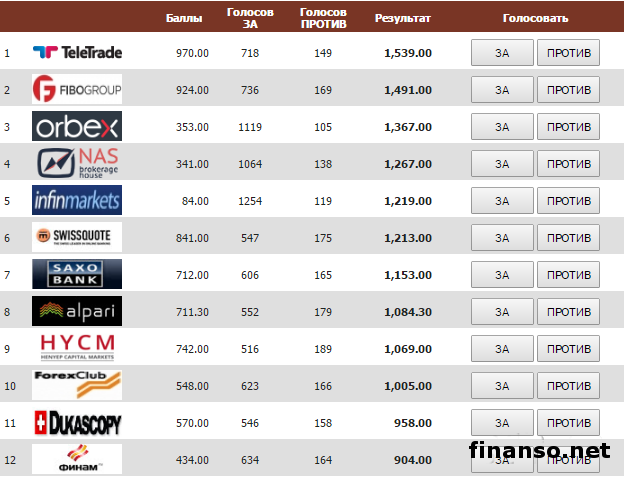 Как выяснили корреспонденты "Украина сегодня: Finanso.net", Без аналитики провести успешную операцию на Международном валютном рынке Форекс очень сложно. А все из-за того, что успех каждой сделки непосредственно зависит от того, насколько аналитика, предоставленная брокерской компанией, была качественной. Поэтому ничего нет удивительного в том, что брокер, который не только отвечает за свои слова, но и заботится о благосостоянии своих клиентов, абсолютно заинтересован в предоставлении трейдеру самых свежих и точных аналитических данных.Необходимо отметить, что под словом «аналитика» подразумевается многое. Здесь и волновой, и технический анализы, и процентные ставки, и торговые сигналы, и многое другое. Календарь праздников, экономический календарь, последние события в мире, которые могут оказать некоторое влияние на экономику, также относятся к аналитике. Но предоставления таких данных будет недостаточно, чтобы брокерская корпорация была востребована. Она для этого также должна соответствовать всем требованиям Международного валютного рынка и интересовать потенциальных трейдеров в роли объекта для сотрудничества. Специалисты Международного валютного рынка убеждены, что провести правильный выбор брокера, который предоставляет свежую и качественную аналитику, и другие услуги можно, если осуществить анализ рейтинга, созданного специалистами Академией трейдинга MasterForex-V, так как именно он основан на большом количестве параметров, абсолютно независящих друг от друга. Как выяснили корреспонденты "Украина сегодня: Finanso.net", в номинацию рейтинга брокеров, предоставляющих лучшую аналитику, включены корпорации, которые входят в наиболее авторитетный международный рейтинг брокеров Форекс Академии Masterforex-V на сегодня. Из представленной таблицы видно, что в номинации учитываются и баллы этого рейтинга (у TeleTrade - 970 баллов, у FIBO Group – 924 и т. д.) Рейтинг брокеров Форекс с лучшей аналитикой. Из табличных данных видно, что: - на первом месте - компания «TeleTrade». Это не просто брокер, а известный во всем мире бренд с 20-летней историей успешного развития. На сегодня этот брокер является одним из самых крупных на территории СНГ и других стран мира. - второе место занимает «FIBO Group». Эта брокерская компания основана в 1998 году и по сегодня демонстрирует довольно высокие стандарты работы с клиентами. За время существования и успешной работы, корпорация не была ни разу замешана в скандалах, а многие корпорации сотрудничают с ней с момента ее основания; - третье место принадлежит компании «ORBEX», основанной в 2010 году и быстро завоевавшей доверие международных трейдеров, за счет комфортных условий и надежности финопераций. Всего за пару лет, Orbex из маленькой кувейтской корпорации, вырос до лидерских позиций на рынке Форекс. Сейчас Orbex активно функционирует не только на Ближнем Востоке, но и в Европе, Канаде, Австралии, Южной Америке и Африке. Главный офис корпорации находится на Кипре. Далее следуют: - Infin Markets; - Swissquote Bank SA; - NAS Broker; - Saxo Bank (Саксо Банк); - Форекс Клуб (Forex club); - Dukascopy Bank SA; - Alpari Limited; - FreshForex; - Admiral Markets; - RoboForex; - Альфа Форекс (Альфа банк); - HY Capital Markets; - Finam (Финам); - FBS Markets Inc. Каждый желающий принять участие в голосовании, может это сделать. Единственное ограничение – это IP. Для этого нужно зайти на страницу рейтинга и отдать свой голос «за», или «против» л