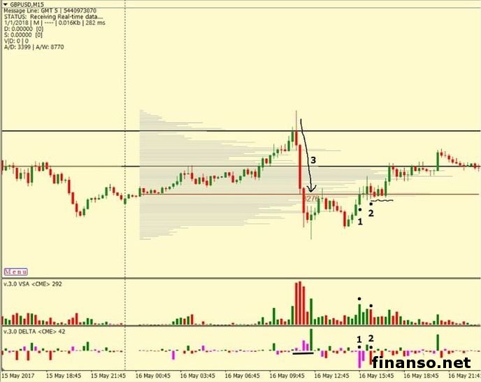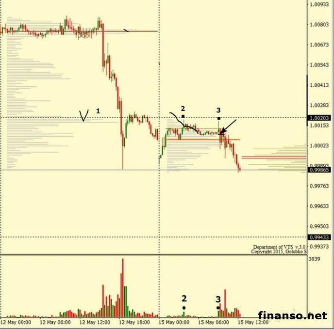 " Как передают корреспонденты "Украина сегодня: Finanso.net", верно определить точку входа в Forex – это только 50% успеха", - скажет любой профессионал в области трейдинга. Мало вероятно, что найдется трейдер, которому понравится просадка в 100 и 20 пунктов после открытия сделки.Как же трейдерам найти точки входа в рынок? В Академии есть более двадцати различных способов. Один из них - метод сопоставления сигналов движения цены с cигналами объема. На чем основан анализ рынка? Обратите внимание на рисунок 1, где продемонстрирована короткая позиция по Швейцарскому Франку USD/CHF на валютном рынке Форекс. Кажется, продажа валюты совершена на базе анализа ценового графика. Но применяя специальную программу-советник, на график накладывается объем фьючерса Швейцарского Франка 6S и видим, что не смогут увидеть большинство трейдеров Форекса – проторговку объема по мере развития тренда. Ценовое движение тогда обретает абсолютно другой смысл и логику, чем сухие закономерности теханализа. Благодаря объему выявляются места давления на цену крупных игроков. Это уровни, где точки входа на рынок будут лучше всего защищены от сбивки стопа. На рисунке в точке 1 советник демонстрирует проторговку максимального объема во время сессии в Америке. Именно здесь крупный игрок набирает короткую позицию с помощью покупателей, готовых торговать на отскок от дневного минимума. На тестировании уровня - сигналы 2 и 3, рост их объема сообщает, что возле уровня активно привлекается рыночный спрос. Логичный вопрос: если маркет-мейкер готовится к продаже, за счет набора объема на Форексе, то что будет с покупками? Ответ скрыт в конфигурации свечек 2 и 3, которые имеют длинные хвосты сверху и сжатые тела на повышенном объеме. Наш советник однозначно и четко показывает это в гистограмме объемов под ценовым графиком. Эти сигналы указывают на то, что заявки покупателей стали "топливом" для крупного игрока, реализовавшего за счет них свою продажу. Стратегия маркет-мейкера все также эффективна. Так, крупняк торгует против толпы на медвежьем тренде. Точки входа с индикатором VSA на Форекс. Объем в гистограмме под графиком цены советник Форекс VOLEхpertME синхронизирует с цветом ценовых свечек. Это позволяет легко сравнивать медвежьи и бычьи импульсы, усиливая сам метод анализа объема и спреда (VSA). На рисунке выше после свечи покупок 3 образуется сильный медвежий бар, его объем на Форексе в 2 раза мощнее объема в свече 3. Сигнал обозначает доминирование предложения, и подтверждает присутствие высоких продаж от уровня. 1. Скрытая игра на повышение. Для того чтобы вскрывать сложные манипуляции с ценой, на рынке требуются не менее эффективные инструменты. В руках умелого трейдера индикатор дельта bid/ask может быть очень мощным "сканером" скрытых покупок или продаж маркет-мейкера. В точке 1 сильная бычья свеча на высоком объеме, но с минусовой дельтой (эксперт объемов VOLEхpertME демонстрирует сиреневый столбик с отрицательным значением в гистограмме под графиком цены Форекс). Сигнал указывает на продавцов, которые заперты в убыточных позициях. Затем происходит попытка продаж давить на цену, посмотрите на медвежью свечу с объемом выше среднего и уверенной отрицательной дельтой (2). Но должного эффекта нет: вместо падения цена не меняется и снова идет вверх. 2. Как определять перепроданность Форекс? Важ