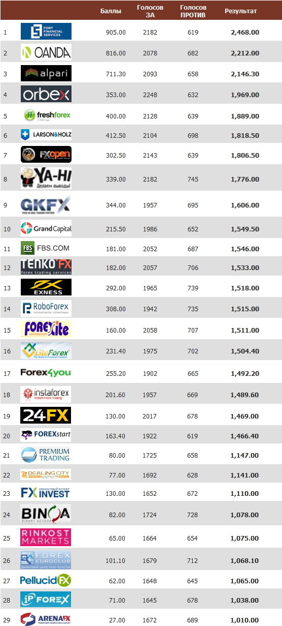 В номинацию на лучшего брокера мира для начинающих трейдеров были включены те компании, которые входят в наиболее авторитетный на сегодняшний день международный рейтинг брокеров Форекс Академии Masterforex-V. Как видно из представленной таблицы, в номинации учитываются и баллы данного рейтинга (у Fort Financial Services – 2468 баллов, у OANDA (Оанда) – 2212, у Альпари - 2146 и т. д.), и результаты голосования на странице лучшего брокера мира для начинающих трейдеров. Лучший Форекс-брокер мира для начинающих трейдеров в мае 2017 года. Как видим: - на первом месте расположилась компания "Fort Financial Services". Этот брокер работает на международном рынке с 2010 года и предоставляет финансовую гарантию для своих трейдеров от канадской корпорации. Компания сделала основной акцент в своей работе на первоклассный сервис, который также дополнен множеством сопутствующих услуг; - второе место – "OANDA". Данная компания работает на рынке Форекс уже более 20 лет и использует новейшие технологии для предложения своих услуг торговли на рынке Форекс как для частных лиц, так и для крупных корпораций; - на третьем месте оказалась компания "Alpari Limited", которая пользуется доверием у всех своих клиентов благодаря безупречной репутации. Далее в рейтинге разместились: - ORBEX - FreshForex - Larson&Holz - FXOpen - YA-HI.com - GKFX - Grand Capital - FBS Markets Inc. - TenkoFX - EXNESS (Экснесс) - RoboForex - Forexite - LiteForex - Forex4you - InstaForex (Инстафорекс) - 24FX - ForexStart - Premium Trading - Dealingcity - FX-Invest - Binoa - Rinkost Markets - Forex EuroClub - Pellucid FX - iP Forex - Arena FX |
