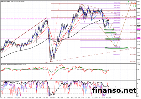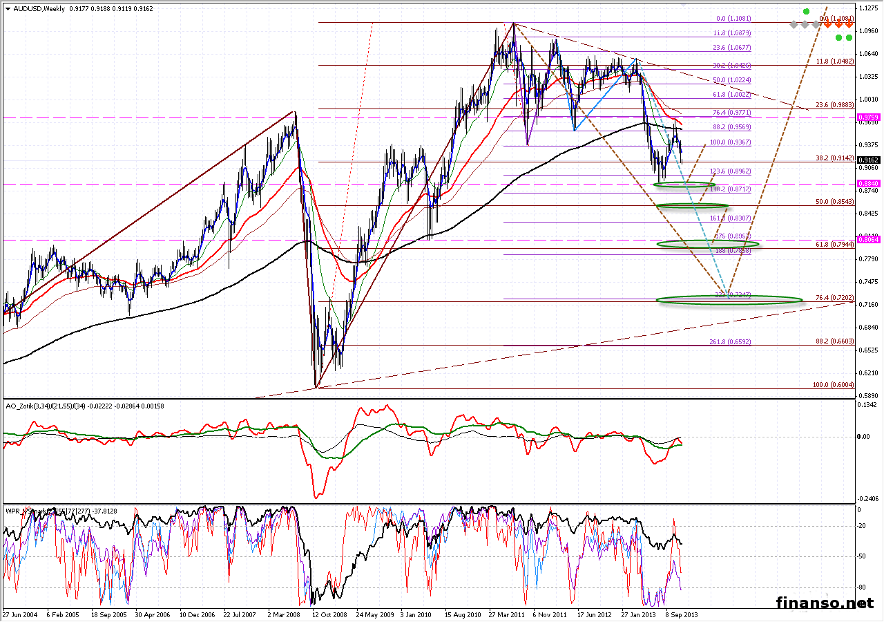 Как утверждают аналитики Societe Generale, австралийский доллар к 2016 году значительно подешевеет, причем по прогнозам некоторых из них падение составит около 25%. Все это они связывают с дешевеющим рынком меди, а также с уменьшением доходности от государственных облигаций. Так ли это или аналитики допустили ошибку в расчетах, анализируют корреспонденты издания “Украина сегодня: Finanso.net”.Причины падения австралийца:Ужесточение валютной политики Соединенных штатов Америки непременно отразится на мировой экономике, в частности, укрепление позиций доллара США значительно, как предполагают аналитики Societe Generale, повлияет на австралийский доллар. Однако не только действия ФРС оказывают воздействие на австралийскую валюту, возможно, в большей степени она пострадает от дешевеющей меди. Дело в том, что Австралия является одним из крупнейших экспортеров красного металла в мире, объемы поставок достигают 2 млн. тонн в год. Так как в мире сейчас идет снижение стоимости на драгоценные металлы, то это, конечно, и отразится на меди. Специалисты компании Societe Generale считают, что рынок меди упадет на 14% за следующий год, только из-за этого валютная пара AUD/USD потеряет около 9% от текущего уровня. Вдобавок ко всему специалисты считают, что процентная ставка США станет выше ставки Австралийского резервного банка, что приведет к еще большему удешевлению национальной валюты Австралии. Возможные цели движения пары AUD/USD:Фундаментальный анализ важен и является неотъемлемой частью повседневной работы трейдеров и многих инвесторов, однако не стоит забывать и о техническом анализе, к которому сейчас и обратимся. Так, речь шла о годовом промежутке, то рассматривать имеет смысл график большого временного промежутка, поэтому чтобы было более информативно, рассматривался недельный график. На данный момент пара находится между двумя уровнями, очень сильным сопротивлением на уровне 0.9759, от которого цена пошла вниз, и поддержкой 0.8840, судя по движению цены, эта поддержка скорее всего будет преодолена. Ближайшим сильным уровнем, который может остановить цену и заставить задуматься о том, продолжать ли падение, будет уровень 0.8543 при пробитии которого следующей очень сильной поддержкой будет 0.8064. Таким образом, чтобы оправдать прогнозы аналитиков Societe Generale цена должна опуститься до 0.7240, до этого уровня существует несколько сильных поддержек, которые цене вряд ли удастся прошить на данном импульсе и нужно будет повышение волнового уровня. И только после этого повышения, то есть отката вверх и дальнейшего пробития минимума, можно судить о том, насколько правы специалисты Societe Generale. |