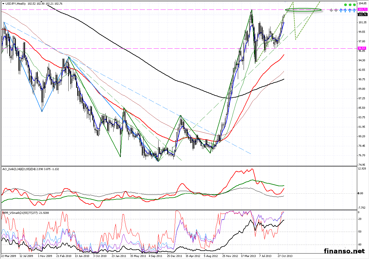 Валютная пара USD/JPY продолжает свой рост, который начался 30 сентября 2011 года и продолжается по сегодняшний день. Несмотря на пессимизм многих инвесторов относительно дальнейшего роста, из-за сужающегося флета, который длился с 22 мая 2013 года, в этой паре восстановился полный порядок, хотя она сейчас и находится в опасной зоне сопротивления предположительно в последней волне импульса. Чего ждать от дальнейшего движения иены, рассказывают корреспонденты издания «