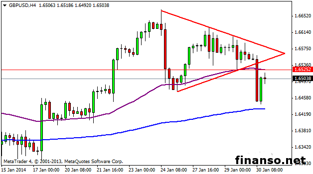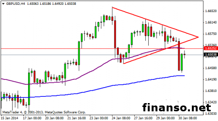 Симметричный треугольник, который был замечен несколькими днями раньше, паре GBP/USD пробить все-таки удалось. Такую информацию сообщили эксперты компании Optionova журналистам популярного издания «Украина сегодня: finanso.net».Эксперты рынка Форекс отмечали в середине недели, что вероятность пробоя верхней границы сформировавшегося симметричного треугольника достаточно высока. Это связывают с тем, что тренд, который входил в треугольник, являлся «бычьим». Но также аналитики утверждали и то, что пробой ценой может быть в любом направлении. Прошедшую неделю пара GBP/USD завершила пробитием нижней стороны, словно убегая из треугольника, а также и 55 EMA (на графике обозначена фиолетовой линией). После пробития двух весьма важных уровней цена на близкое расстояние придвинулась к 200 ЕМА ( на графике отмечено синей линией), потом опять стремительно совершила откат к 55 EMA. Теперь показатель 1.6525 будет являться зоной сопротивления для валютной пары GBP/USD. Какие события произойдут в судьбе пары на рынке Форекс, мы узнаем уже завтра, в начале новой недели, 3 февраля. |