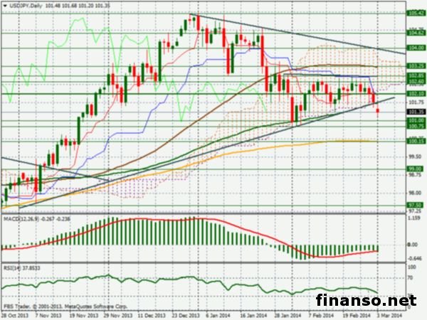 По сообщениям представителей брокер-компании FBS Markets, пара валют USD/JPY на Форексе в понедельник начала торговую неделю с гэпом вниз на уровне 101.48, однако пятничную сессию завершила под дневным облаком Ишимоку. Подробности ситуации изучали корреспонденты популярного издания «Украина сегодня: Finanso.net».Аналитики Форекс считают, что иена представляет собой более сильное убежище, чем американский доллар.А это говорит о том, что существующая политическая напряженность влияет на падение котировок пары доллар/иена. Немаловажным фактором для позитивного настроя иены являются и опубликованные на прошедшей неделе неплохие статистические данные в Японии по показателям инфляции. Стоит отметить, что этот показатель разместился на 5-летнем максимальном значении. В январе 2014 года потребительские цены увеличились в годовом исчислении на 1.3%. «Доллар США подошел к области перепроданности на H4, далее он имеет возможность опуститься еще ниже и заняться тестированием минимумов февральских показателей в зоне 100.75. Также нельзя обойти вниманием и спад курса к 200-дневной скользящей средней на 100.15. Многие уровни поддержки находятся в области 101/100», - констатируют специалисты Форекс компании FBS. Как видно на графике, 55-дневная скользящая расположена на отметке 99.55. Область сопротивления находится на уровнях 101.70, 102.10 и 102.60. Аналитики Форекс предполагают негативный сценарий, поскольку торги в последние дни происходили в узком коридоре. Также на этой неделе ожидается большое количество статистических отчетов из США. Внимание участников Форекс на этой неделе будет сосредоточено на настроениях рынков и на данных по макроэкономическим показателям из США. |