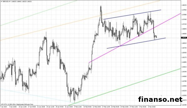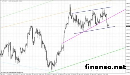 «Медведи» сильным ударом пробили линию поддержки последних двух недель (выделено малиновым цветом), что видно на графике пары GBR/USD, опустив цену до нижней границы канала (синие линии). Ожидается цена в районе 1,6510-1,6515 в случае прохода вчерашнего минимума на отметке 1,6622. «Также возможен рост котировок пары фунт/доллар, если этот минимум устоит, до пробитой линии поддержки, в зону 1,6690-1,6700», - разъясняют аналитики Форекс.