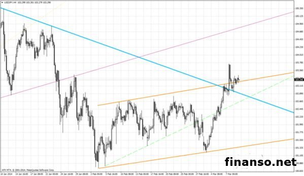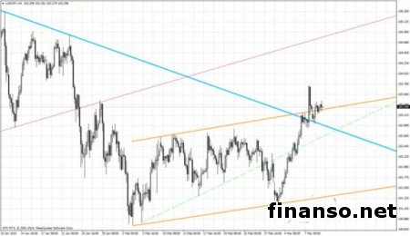 Как видно на следующем графике, линия нисходящего движения (голубая линия) валютной пары USD/JPY пробила верхнюю границу диапазона (оранжевые линии), однако особого энтузиазма «быков» на валютном рынке пока незаметно. По мнению аналитиков Форекс компании, четких направлений движения пары доллар/иена пока не видно.