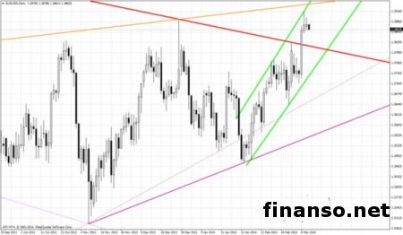 На четырехчасовом графике, представленном специалистами Форекс, отчетливо видно, что под верхней границей восходящего канала (зеленые линии на графике) находится линия цены. К пробитой линии сопротивления (красной линии), скорее всего, ожидается откат. Как отмечается специалистами Arsenal Fx, «быков» ждет линия сопротивления максимумов последних двух лет (оранжевая линия) в области 1,3940-1,3945, если они отважатся штурмовать последний максимум на отметке 1,3915.