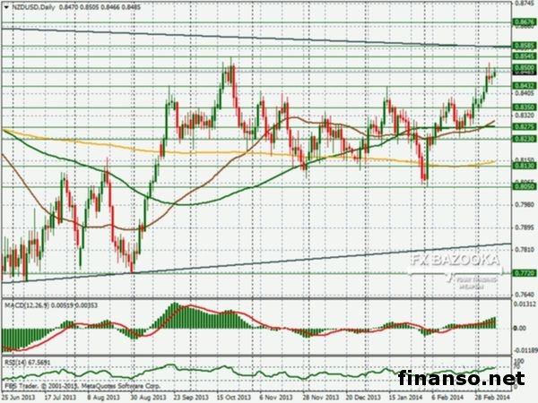 «Движение пары NZD/USD, предположительно, будет ограничиваться коридором 0.8500-0.8430. Как ожидается, РБНЗ должен увеличить ставку по процентам на 25 б.п., что после увеличения составит 2.75%», - поделились информацией с корреспондентами издания «Украина сегодня: Finanso.net» эксперты Форекс-фирмы FBS Markets.