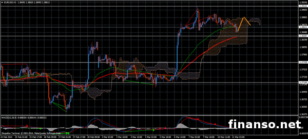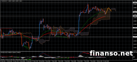 По мнению специалистов Форекс, коррекция стоимости будет находиться внутри границ облака Ишимоку. Цена пары ведет торги на отметке скользящих средних EMA (50 и 100) и облака Ишимоку. Этим самым стоимость подтверждает наличие явных преимуществ состояния коррекции на валютном рынке. Гистограмма MACD и импульсы OsMA находятся под отметкой со значением «0». А это должным образом говорит о преобладании настроения «медведей» на Форексе. Повлиял на котировки пары валют евро/доллар и выход отчетов статистики по торговому балансу Германии. В январе текущего года показатель по национальному экспорту этой страны увеличился на 2,2 % в месячном измерении, что составляет величину более той, которая ожидалась участниками рынка. Экспорт должен был возрасти на 1,5%. Импорт стал шире на 4,1%. Темпы роста в целом весьма явно превзошли увеличение на 1,4%, которое предрекалось стратегами Форекса.