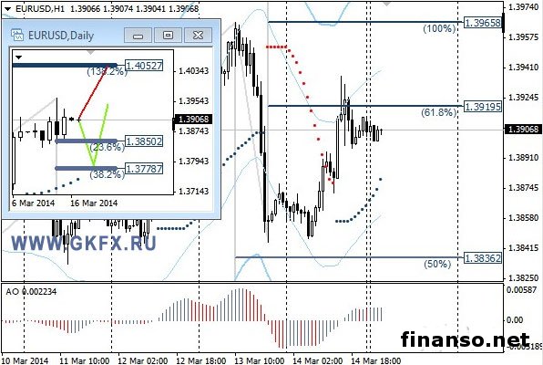 Сегодня, 17 марта, никаких важных и значительных статистических данных по европейской зоне не ожидается, торговые сессии будут проходить, опираясь на технические факторы. Цена валютной пары проходила на финансовом рынке Forex на минувшей неделе в красном коридоре движения цены. На предстоящую неделю аналитики валютного рынка Форекс рассматривают два возможных варианта перемещения цены: основной красный и альтернативный зеленый. Важными уровнями на понедельник, 17 марта, являются зоны, отмеченные на предоставленном ниже графике. Индикатор АО располагается в положительной зоне и уверенно увеличивается, чем указывает на присутствие у пары желания соблюдать движение по возрастающей. Индикатор существующего тренда говорит об увеличении курса рассматриваемой валютной пары евро/доллар на финансовом рынке Форекс. Пара находится вне рынка.