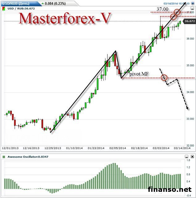 В воскресенье, 16 марта, курс российского рубля по-прежнему демонстрировал снижение к американскому доллару и расположился в области 36,672. Наиболее близкие важные отметки сопротивления значатся на новых максимальных показателях 36,85 и 37. Пивот МФ 34,550 является в данном случае достаточно сильной поддержкой.