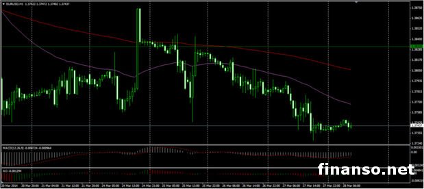 Динамика пары евро/доллар. Евро к американскому доллару вел торги на Форексе на отметке 1,3769 и в какой-то момент добрался до 3-недельной минимальной отметки 1.3740. Евро по-прежнему остается под давлением из-за мягкой риторики ЕЦБ, начинающего говорить о предстоящем смягчении денежно-кредитной политики для борьбы с дефляцией. Опасность для евро несет и публикация индекса потребительских цен, назначенная на понедельник, 31 марта, и совещание ЕЦБ, которое пройдет в четверг, 3 апреля.