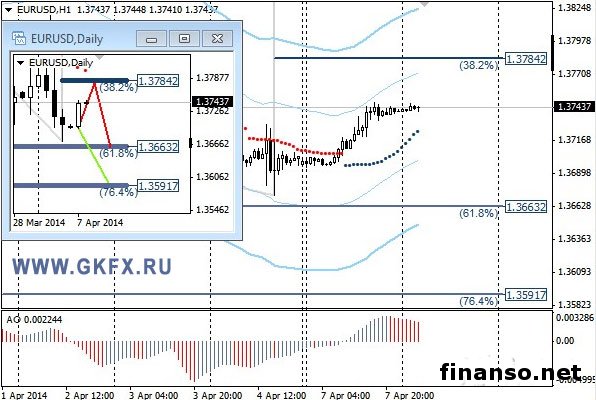 Пара валют EUR/USD умеренно набирает обороты на финансовом рынке Forex по красному варианту перемещения стоимости за неделю. Курс этой пары может снова начать падение уже от отметки 1.3750, так и не достигнув ожидаемого показателя 1.3780.Однако сегодня утром, 8 апреля, пара показала готовность двигаться по восходящей. Невзирая на это, специалисты компании GKFX советуют вести операции на валютном рынке по правилам красного варианта. «На этой неделе ожидаются два варианта вероятного движения цены, основной красный и альтернативный зеленый», - сообщили аналитики брокерской компании. Важные уровни на вторник, 8 апреля, отмечены на представленном ниже графике. Показатель АО располагается в положительной области и движется вниз, демонстрируя коррекцию накануне вероятного продолжения увеличения стоимости пары на рынке Форекс. Индикатор тренда говорит об увеличении. Реализация предполагается от отметки 1.3780 с целевыми уровнями 1,3750, 1,3730 и 1,3690. Подробности ситуации на валютном рынке изучали корреспонденты издания «Украина сегодня: Finanso.net». |
