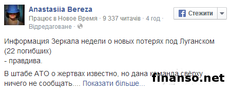 Возле поселка Счастье, что в Луганской области, в июньскую ночь с 17 на 18 число текущего года между силами Антитеррористической операции и террористами произошло столкновение, о чем, ссылаясь на источник в Министерстве обороны, пишет издание ZN.UA.Как удалось выяснить корреспондентам издания «Украина сегодня: Finanso.net», согласно сводкам Минобороны, по состоянию на пять часов раннего утра в среду, 18 июня 2014 года, противостоящие террористам силы Антитеррористической операции в Луганской области понесли потери личного состава. Всего во время столкновений с террористами на территории Луганской области было убито 15 украинских силовиков, а еще 13 человек считаются пропавшими без вести. В бою около поселка Счастье погибло 11 военнослужащих 128-й горно-пехотной бригады (г. Мукачево) и 80-го аэромобильного полка (г. Львов). Кроме того, 24-й батальон территориальной обороны потерял четверых солдат. Двое военнослужащих из 128-й горно-пехотной бригады получили ранения, еще трое человек ранены в 80-м аэромобильном полку, в 24-м батальоне территориальной обороны ранено четыре человека. Что сообщают журналисты?В то же время, судьба 13 военнослужащих из различных подразделений Антитеррористической операции пока остается неизвестной. Журналистка Анастасия Береза на своей странице в социальной сети Facebook подтвердила информацию "Зеркала недели" о новых потерях возле Счастья. Она сообщила о том, что в штабе Антитеррористической операции о жертвах уже известно и в связи с этим сверху была дана команда ничего не сообщать. Также журналистка сообщила о том, что она со своими коллегами общалась с Ириной Геращенко, уполномоченной Президента по вопросам мирного урегулирования конфликта на территории Луганской и Донецкой областей. Они говорили об информационных ошибках Министерства обороны, в частности о том, что недопустимо скрывать фамилии убитых, поскольку они обнародовались даже в военное время. Береза отметила, что сознательное сокрытие информации относительно человеческих потерь должно стать одним из последних аргументов против нынешнего руководства АТО, поэтому она призвала Михаила Коваля, министра обороны, и весь Генштаб распуститься, поскольку они обходятся Украине в преступно большое количество человеческих жизней. |