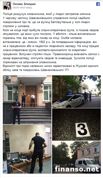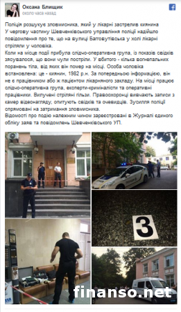 Сегодня в столице Украины Киеве в холле больницы, что на улице Багговутовской, неизвестный застрелил мужчину. Последний скончался на месте происшествия от полученных травм. Сотрудники полиции ищут убийцу. Информацию об этом на своей странице в социальной сети «Фейсбук» сообщила пресс-секретарь столичной полиции Оксана Блищик.