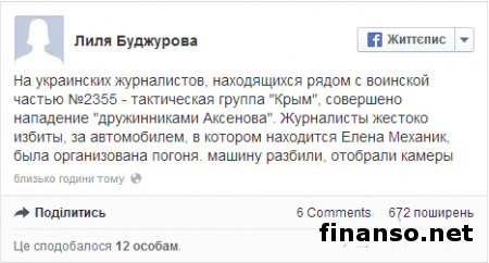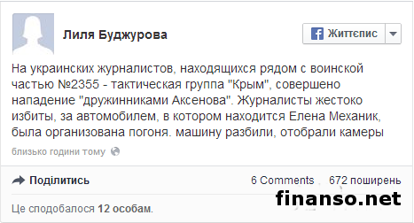 Лилия Буджурова, представитель ассоциации свободных журналистов в Автономной Республике Крым, сообщила, что во время штурма воинской части № 2355, которая находится в 5-ти километрах от Севастополя на Фиолентовском шоссе, совершено нападение на украинских журналистов, в результате которого "дружинниками Аксенова" были избиты сотрудники прессы Украины. Такую информацию она предоставила в прямом эфире на Первом национальном телеканале в ходе телевизионной передачи “Шустер Live”. Более детально о случившемся, а также о всех возможных причинах и последствиях произошедшего рассказали корреспонденты издания “Украина сегодня: Finanso.net”. Так, согласно словам Буджуровой, одна из пострадавших, корреспондент телевизионного канала “Интер” Елена Механик, успела сообщить ей, что во время штурма воинской части журналистов украинской прессы, в частности женщин, жестоко избили, а также повредили дорогостоящую аппаратуру для видеосъемки и передачи репортажей. За журналистами велась погоня.Кроме того, представитель ассоциации свободных журналистов в Крыму Лилия Буджурова рассказала, что “Елена Механик, являющаяся журналистом телеканала “Интер”, позвонила ей на мобильный телефон и сообщила, что в Севастополе начинается штурм украинской воинской части №2355. Грузовой автомобиль КамАЗ протаранил ворота штаба, а на его территории в тот момент находились двенадцать человек. Механик попросила меня срочно выслать группу журналистов телеканала АTR, на котором работаю я. А уже приблизительно в 22 часа по киевскому времени Елена Механик, в очередной раз звоня мне, со слезами в голосе и криками просила меня срочно отозвать журналистов. Ее слова были такими: “Лилия, отзовите срочно журналистов. Всех нас, украинских журналистов, а нас тут находится много, избили жесточайшим образом, били женщин, ломали видеокамеры. Мы убегаем с места происшествия, однако за нами ведется погоня. Нас подрезали, разбили автомобиль, отобрали камеру”, и в этот момент связь с ней прервалась”. Согласно информации украинского издания “Украинская правда”, кроме Елены Механик в автомобиле находились также журналист Андрей Цаплиенко и еще два оператора телевизионного канала “Интер”. |